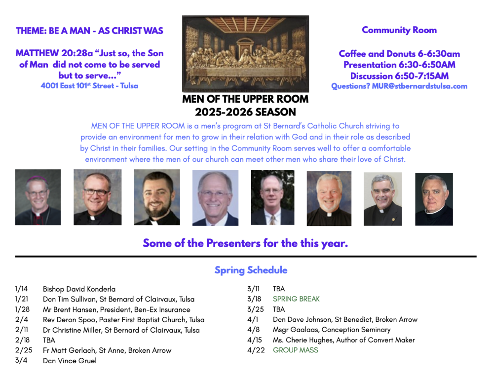 Men of the Upper Room is a men's program at St. Bernard's to help strengthen faith and increase understanding of the Church's teaching. The program combines fellowship with education to promote authentic male leadership according to the teachings of Jesus Christ and the magisterium of the Church. Weekly meetings are held on Wednesdays beginning in the Fall and ending in late Spring. Please click here for the Spring 2026 flyer! If you are new to MOUR, send an e-mail with your name and cell phone number by clicking here.